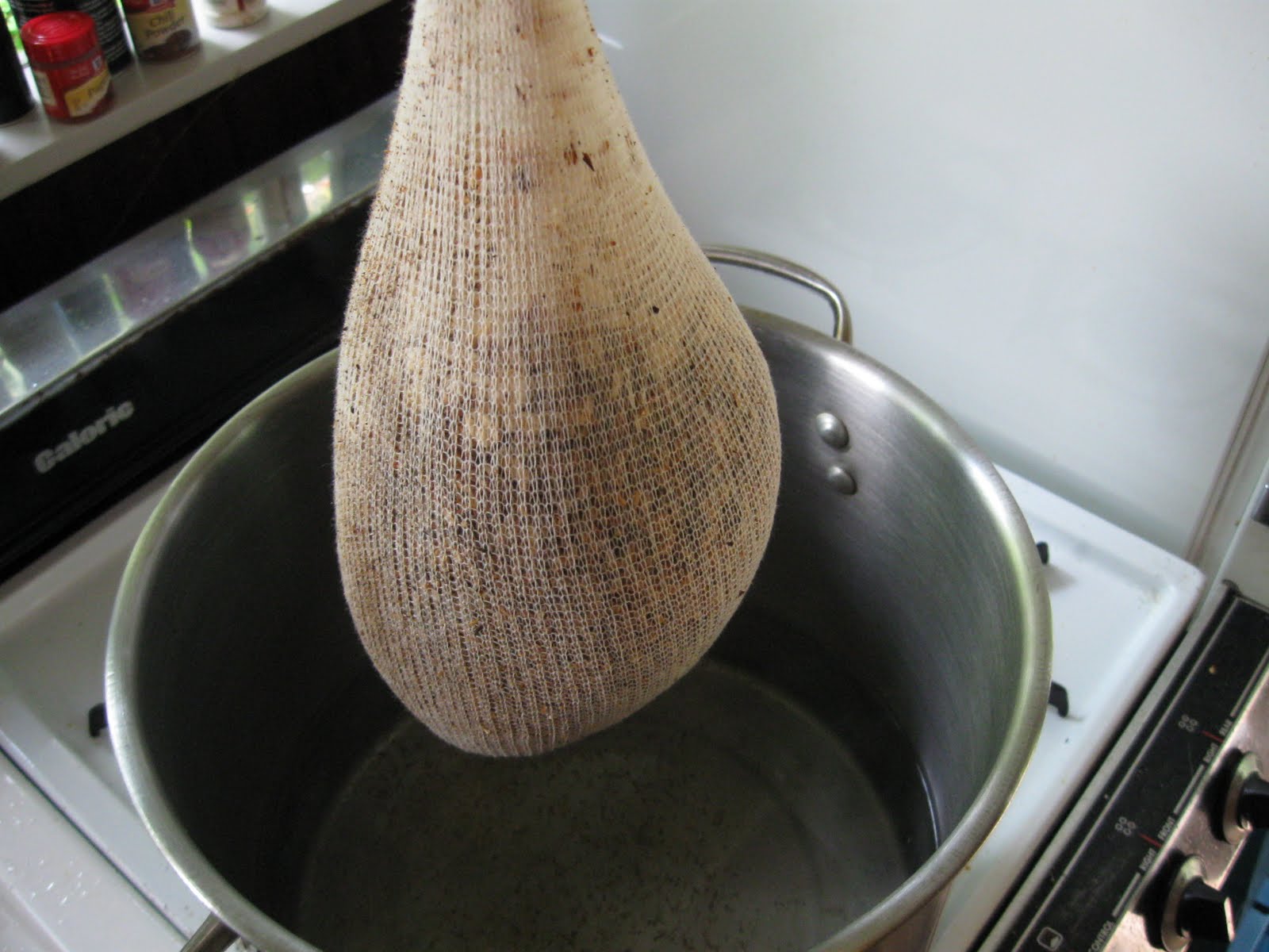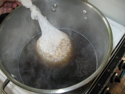 For this recipe, I had a full pound of grain: 1/4# De-bittered Black Malt, 1/2# Crystal 40L Malt, and 1/2# Flaked Oats. Soak the grains for 25 minutes. After this time, remove the bag, let the water drip out, give it a squeeze, and throw your grains in the composter, or feed to your chickens.