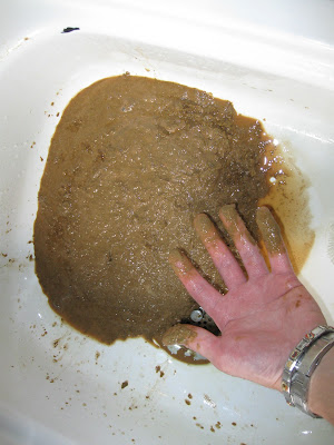 After about a week, the yeast activity should slow down (no more bubbling of the bubbler) and its time to transfer this mixture into a glass carboy for another week of clarifying. This is what was left in the bottom of the bucket by the yeast. Great yeast activity!
