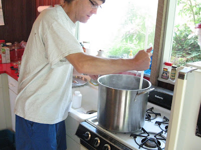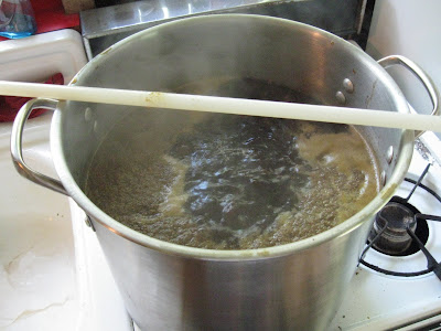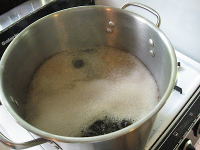Heat it back to a boil. Lots of sugars in this wort(beer mixture) and once it reaches boil, can boil over very easily or burn so watch it carefully (my gas burners are not very strong and I can keep them on high the entire time). Once you reach a roiling boil, adjust your heat to maintain, and set your timer for 60 minutes.