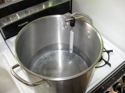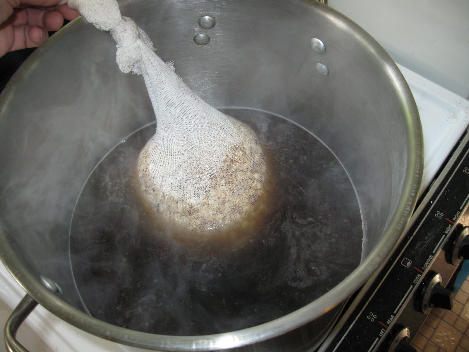 In a large kettle, heat up about 2 gallons of water (I use fresh well water, if yours comes from the tap, you may want to check its quality because things like chlorine and such can throw off your beer) to 155 degrees. Turn off the heat and let your grains soak. Your grains can soak in a grain bag and treat it like a tea bag, letting the colors andn such seep through the grains.