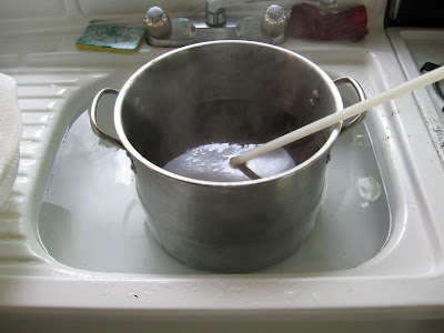 Once the 60 minutes of boiling is over, our goal is to cool this wort down to 80 degrees as fast as possible. There are tools (wort chillers, presses) for this but I fill up my sink with cool water (if your tap water isn't very cool, add ice), and let my pot sit in the water, draining and replacing the water about 3 times.