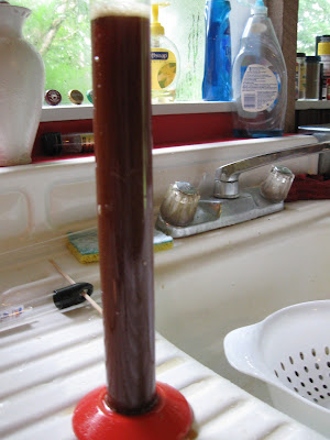 Once you get it to 80 degrees, its time to throw this mixture into a sanitized bucket, add water to make 5 gallons, seal, and place your bubbler in the bung hole (a bubbler is a small device that lets gases out but no air in, preserving that sterile environment. Save a little to take a gravity reading (and taste!) was delicious already!!