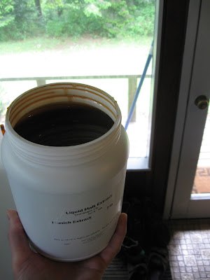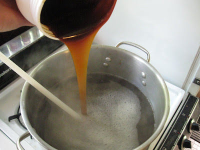 Once you have it to a boil, turn off the heat, and add your extract(s), stirring as you do to make sure it dissolves well. I had 7 pounds of Munich extract and 1 1/2 pounds of Dark 2 Candi Syrup.